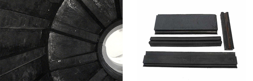 整套的陶瓷磨機橡膠襯板由端襯板(格柵型為花格板)、端部提升條、中心環(huán)(格柵型為中心護板)、填料、筒體提升條(又稱壓條)、筒體襯板、人孔門、緊固件等部分組成。