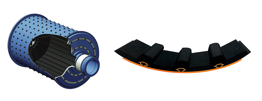 棒磨機是由筒體內(nèi)所裝載研磨介質(zhì)為鋼棒而得名,因兩端鋼棒經(jīng)過研磨后銳利,故此類設(shè)備所采用樟膠襯板主要包括:筒體橡膠襯板部分及配套緊固件,具有低噪音、抗沖擊、耐腐蝕、易更換等優(yōu)點。